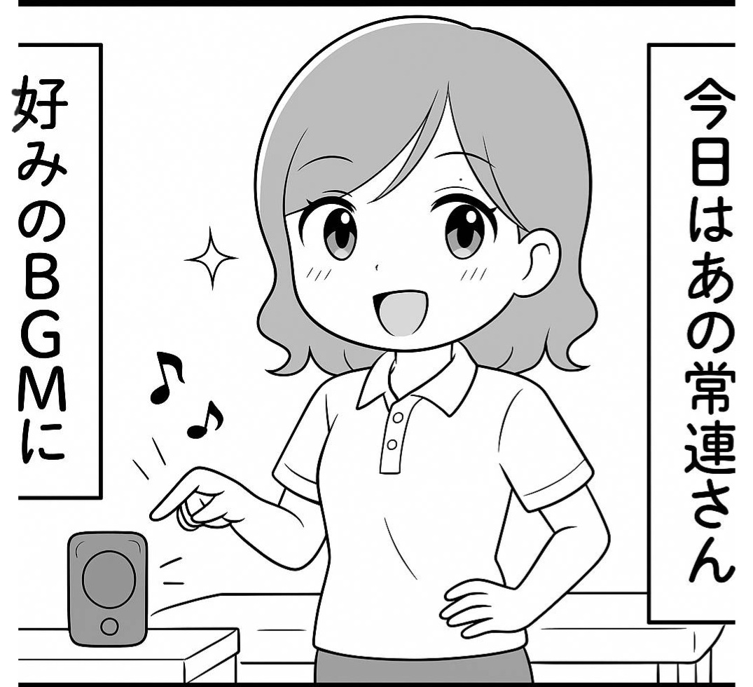 もえみんの1コマ漫画 Aの66「今日はあの常連さん好みのBGMに」