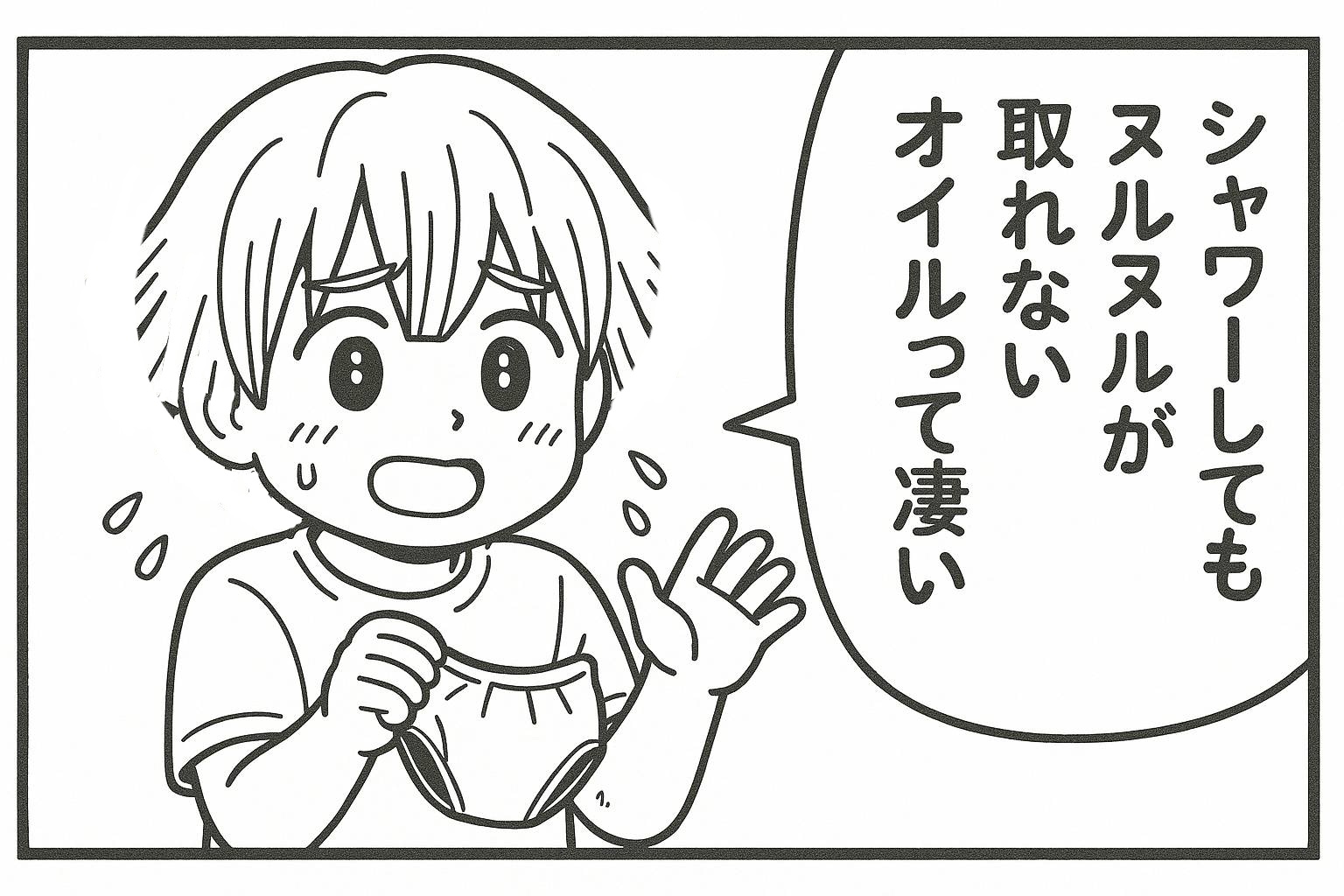 - メンエスくんの1コマ漫画 その52「ヌルヌルが取れないオイルって凄い」 - 2026年1月23日