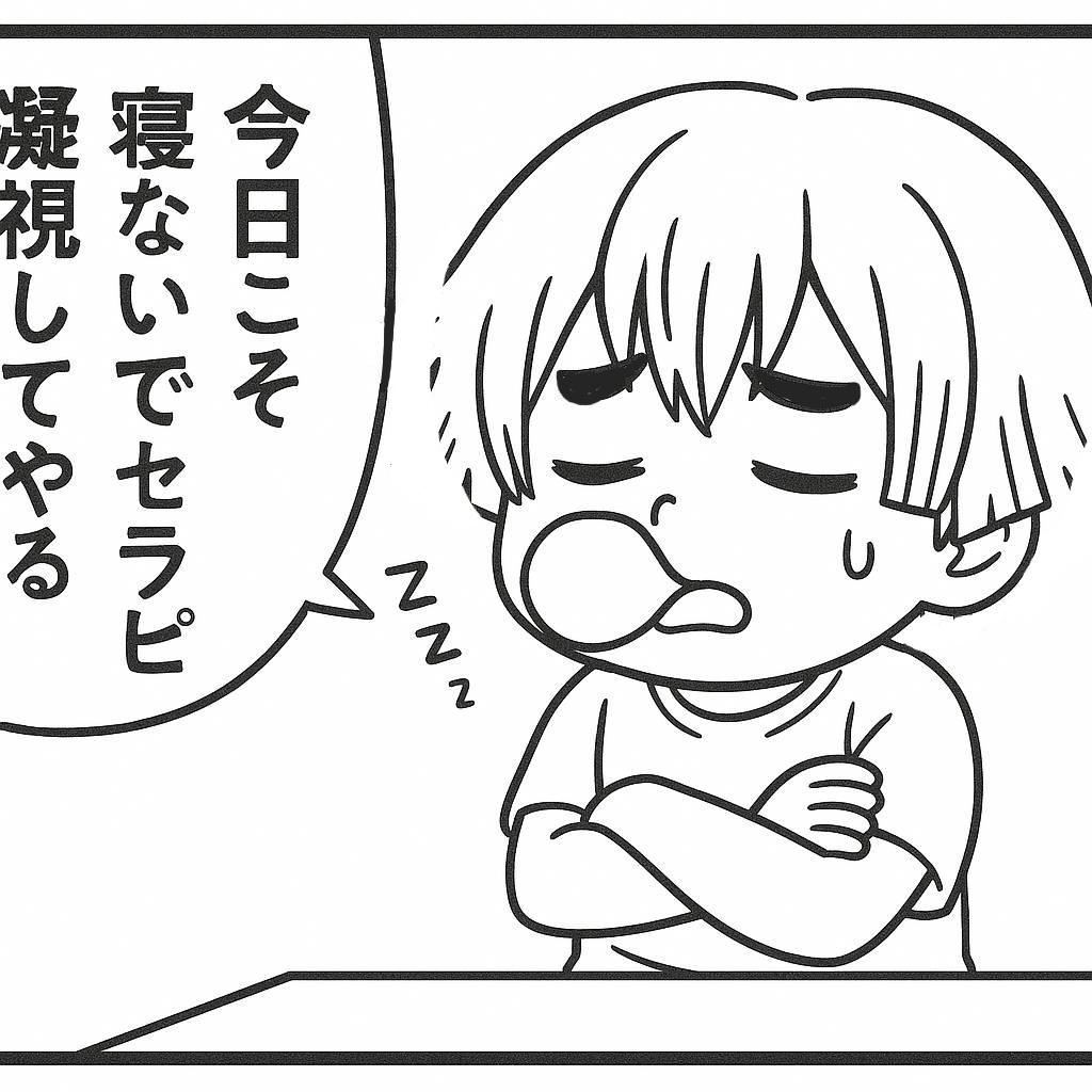 メンエスくんの1コマ漫画 その40「今日こそ寝ないでセラピ凝視する!」