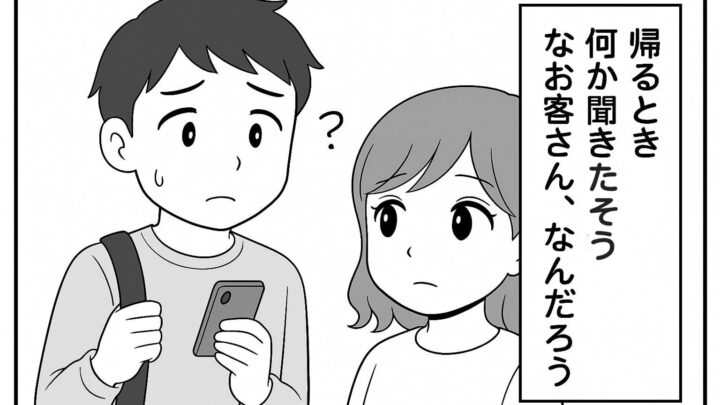 もえみんの1コマ漫画 Aの80「何か聞きたそうなお客さん…LINEかな?」